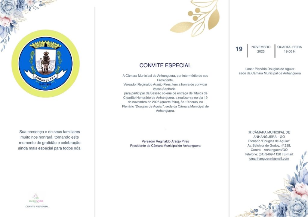 A Câmara municipal de Anhanguera, por intermédio de seu presidente Reginaldo Araújo,tem o prazer de te convidar para esta sessão solene. Na oportunidade haverá a entrega dos títulos de cidadão Anhanguerino e também a homenagem de reconhecimento do dia do psicopedagogo no município. Contamos com a sua presença!